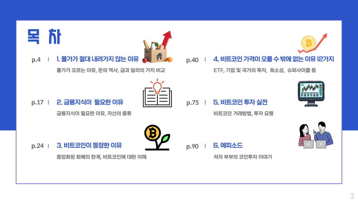 첫번째 책의 내용을 대폭 보강한 본품(비트코인, 이래도 안 산다고?)과, 실제로 투자를 시작한 이후 스스로 공부할 수 있는 요령을 정리한 비밀노트(비트코인 셀프 스터디 시크릿 노트), 총 2종을 세트로 구성하였습니다.