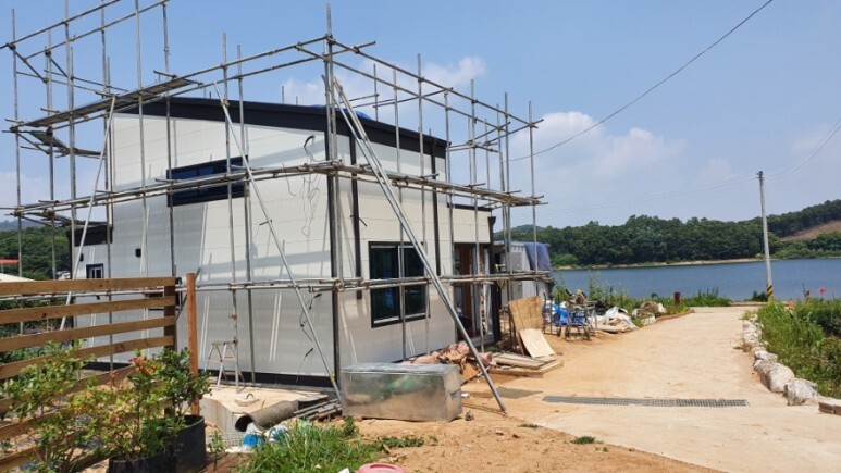 저희 세컨하우스 별채의 경우 층고를 더 높이기 위해 상하 2개의 모듈을 따로 싣고온 후 현장에서 조립하여 다락방의 층고를 충분히 확보하였습니다.