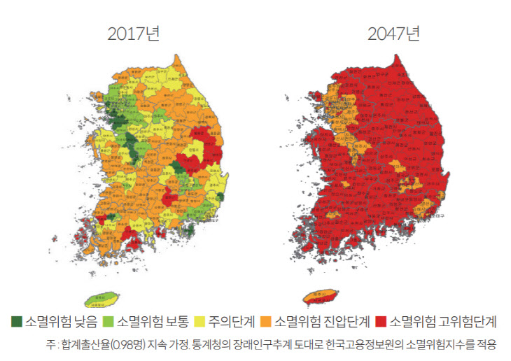 2023.2.24. 국회미래연구원이 작성한 '지방소멸위기 대응 방향' 보고서에 따르면 인구가 급격히 감소해 소멸위기에 해당하는 지역(시,군,구)은 2017년 12곳에서 2047년 157곳으로 10배 이상 늘어날 것으로 전망된다고 합니다.
