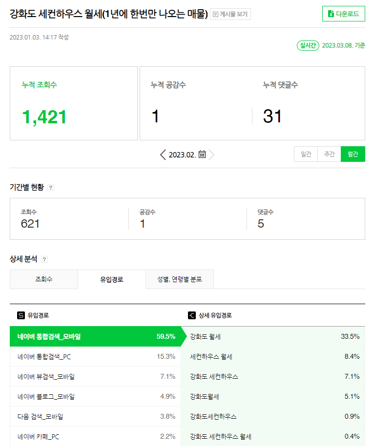 현재까지 약 2달 동안 1,421건의 누적조회수를 보이고 있고, 2월 한달 통계 분석을 해보니 그 중에 86.8%가 네이버 검색으로 유입된 것이고 다음 검색은 3.8%에 불과한 것으로 나타났습니다.