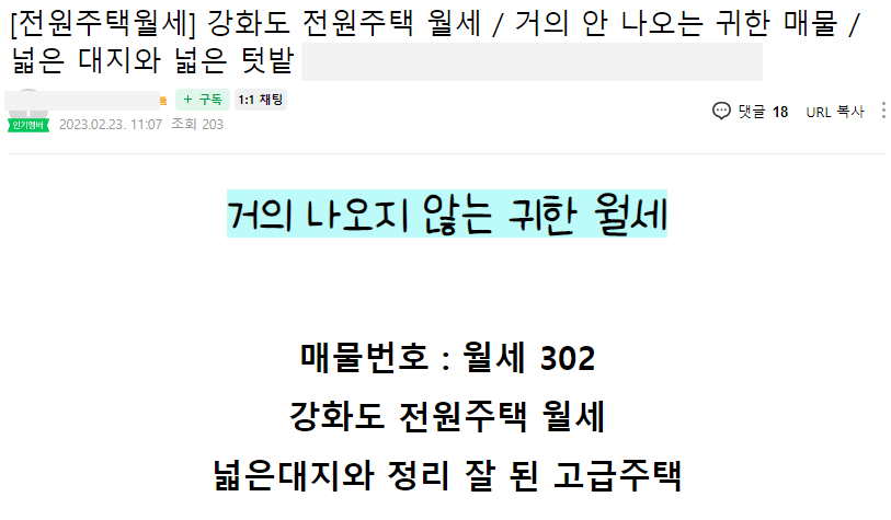아래 그림은 강화도의 한 부동산 카페에 최근에 올라온 글인데 '거의 나오지 않는 귀한 월세'임을 강조했습니다.
