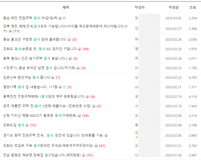 아래 그림은 제가 주로 방문하는 네이버카페에서 '월세'라는 제목이 들어간 글만 발췌해 본 내용입니다.