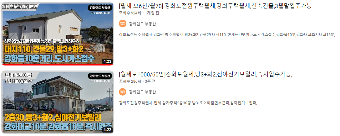 다음으로, 아래 그림은 유튜브에서 강화도 월세 매물을 조사해 보았는데 정말 매물 갯수가 손에 꼽을 정도로 없었습니다.