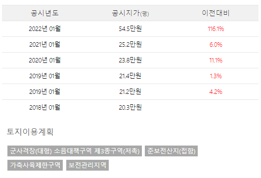 전 상태였을 때는 미미한 지가 상승을 이어가다가 세컨하우스 준공 이후 지목이 "대지"로 바뀌면서 116%가 상승하였습니다. 실거래가를 기준으로 한다면 평당 60만원짜리 땅이 130만원 짜리 땅이 된 것입니다.
