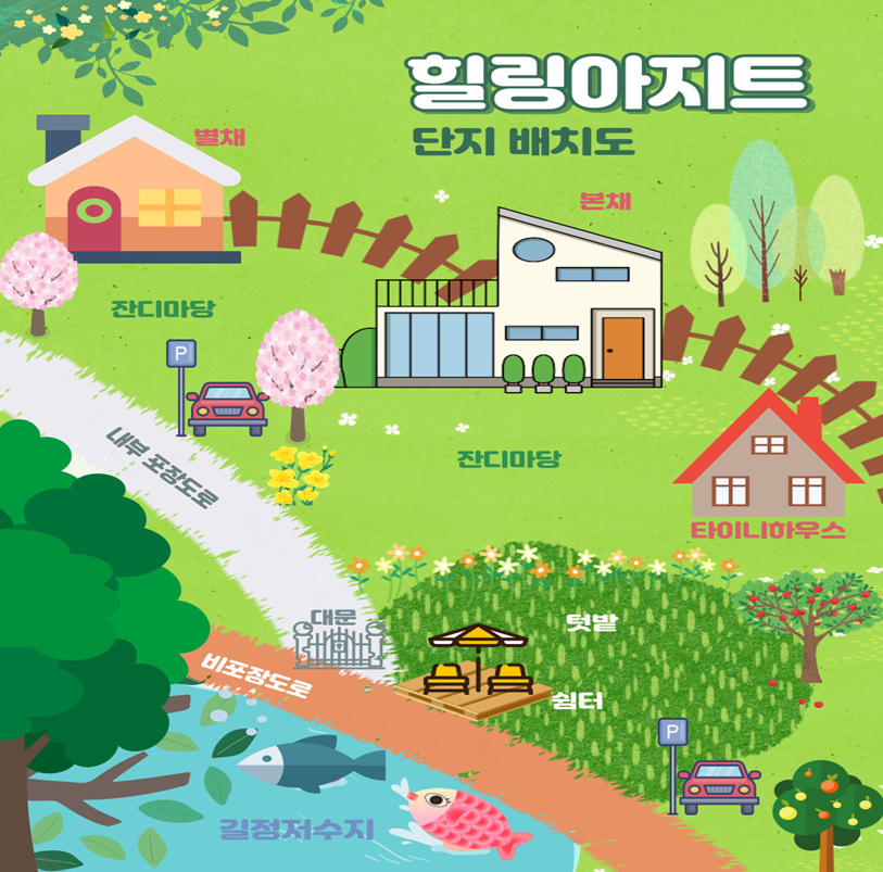 저 같은 경우는 아래 단치배치도에서도 볼 수 있듯이, 제가 오롯이 사용하는 세컨하우스(본채) 외에도 앞뒤 마당에 남는 공간을 활용해 2채의 이동식주택(별채, 타이니하우스)을 더 설치하고 월세임대를 주고 있습니다.