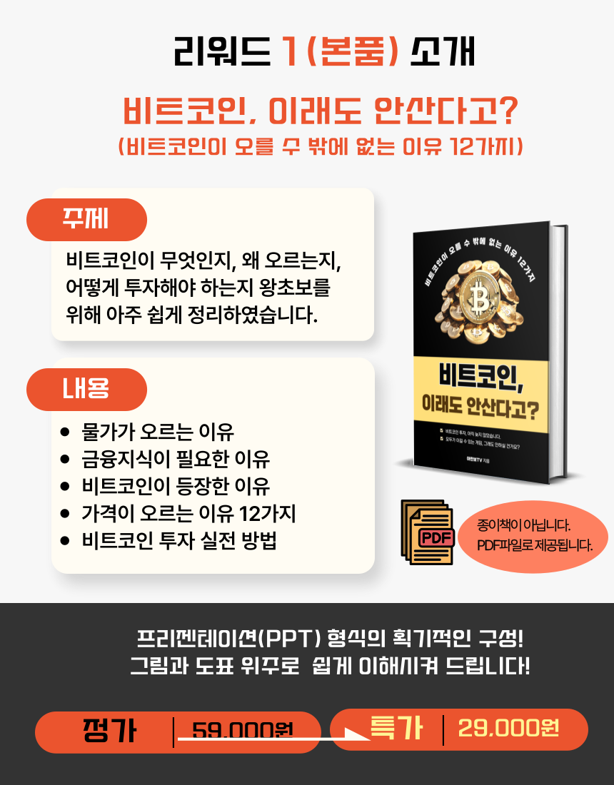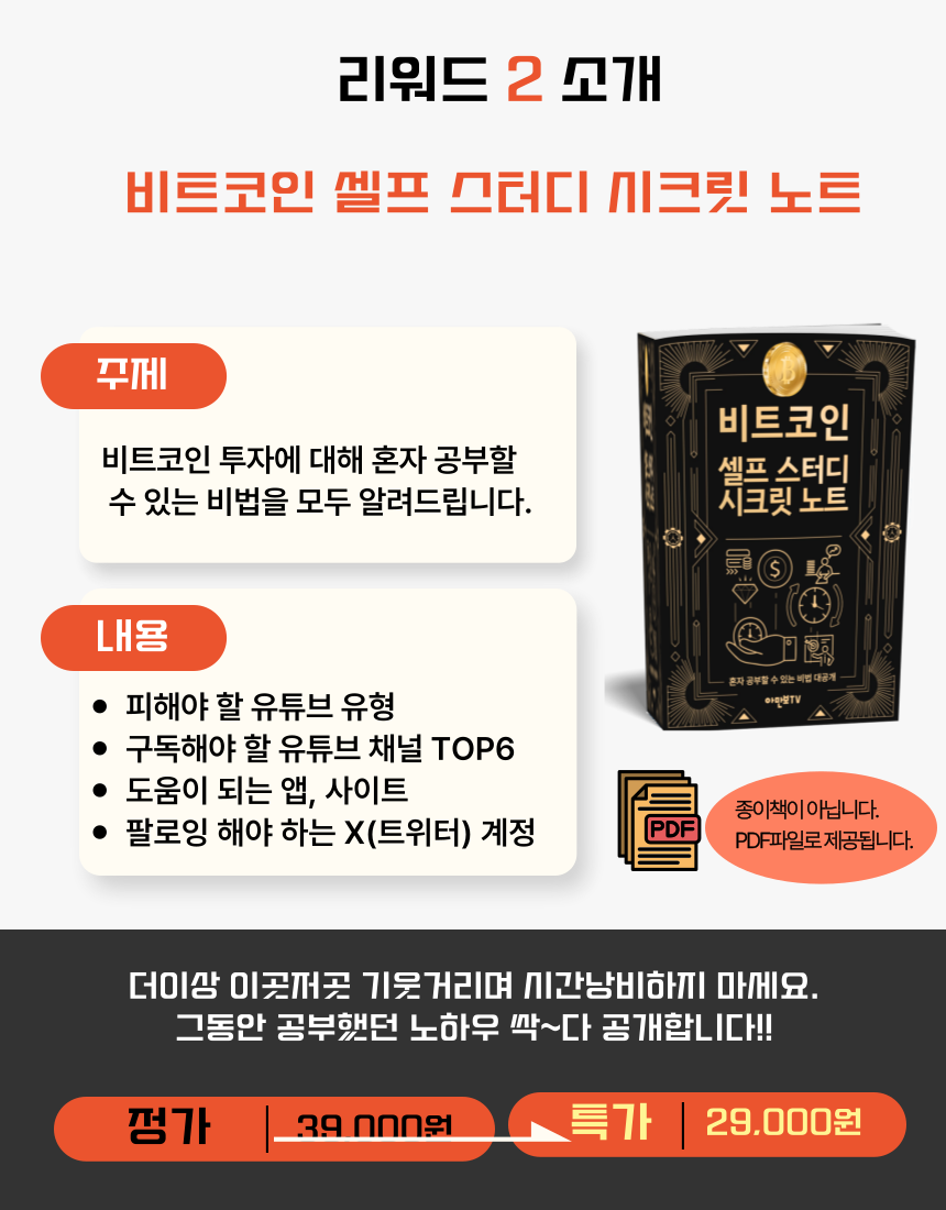 첫번째 책의 내용을 대폭 보강한 본품(비트코인, 이래도 안 산다고?)과, 실제로 투자를 시작한 이후 스스로 공부할 수 있는 요령을 정리한 비밀노트(비트코인 셀프 스터디 시크릿 노트), 총 2종을 세트로 구성하였습니다.